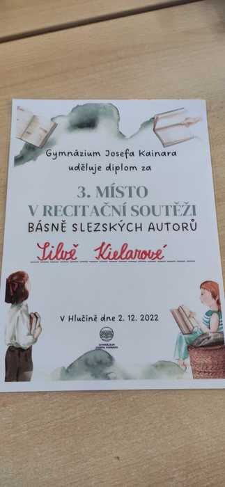 Dne 2. 12. 2022 proběhl na Gymnáziu v Hlučíně již 4. ročník recitační soutěže. Letos se recitovaly básně slezských autorů. Za naši školu jsme vyslali Filipa Bednáře 6.B, Adama Hoferka 7.A, Moniku Návratovou 8.B a Silvii Kielarovou 8.A. Reprezentovali nás velmi úspěšně, neboť Adam Hoferek dovezl ve své kategorii 1. místo za přednes básně Jaromíra Nohavici Vánoční kapr a Silva Kielarová se pyšní ve své kategorii 3. místem za přednes textu Josefa Kainara Dopis pro nemocnou. Tuto krásnou soutěž provázeli studenti z hlučínského gymnázia hudebním vystoupením. Žáci si kromě kulturního zážitku odvezli i krásné ceny. Všem našim zúčastněným žákům děkujeme za reprezentaci.