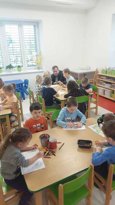 Hody, hody, doprovody, já jsem malý zajíček. Tento název integrovaného bloku nás měl provázet celé přípravy na velikonoční svátky. V začátku týdne si děti osvojily poznatky tradic jara pomocí "Zajíčka Ušáčka" (zlatý déšť, kočičky, řehtačka, pečení beránka, mazance, zdobení kraslic, pletení pomlázky, koledníci..). Seznámili jsme se s pohybovou hrou "Zajíček v své jamce" a následně jsme si vytvořili tupovací technikou zajíčka ve vajíčku. Napodobovali jsme zvířátka pomocí hudebního ztvárnění a nejvíce děti zaujala píseň "Vajíčka". Shlédli jsme edukační video "Velikonoce" a v pátek nás navštívil z místní farnosti kněz s programem pro děti, aby jim přiblížil nejdůležitější křesťanský svátek "Velikonoce" a jeho význam, neboť mnoho dětí v dnešní době nemá již povědomí o původu vzniku tohoto svátku.