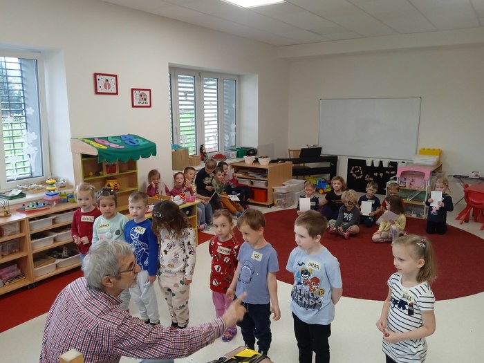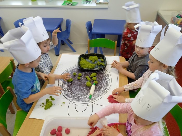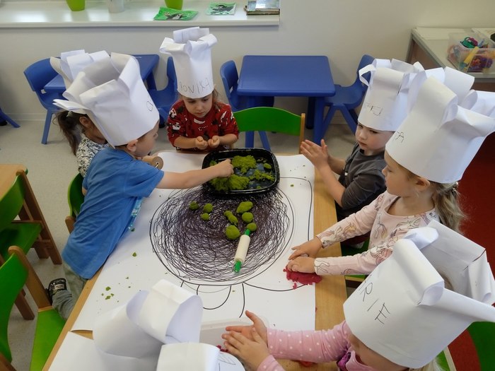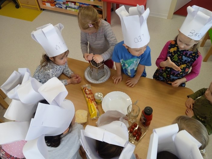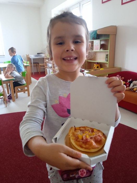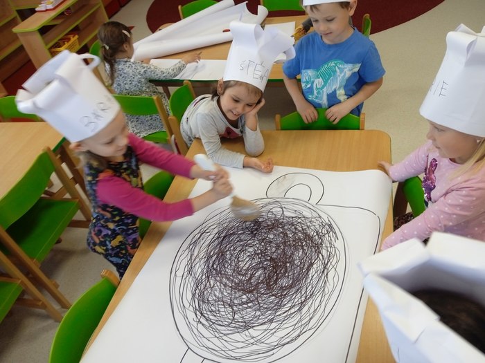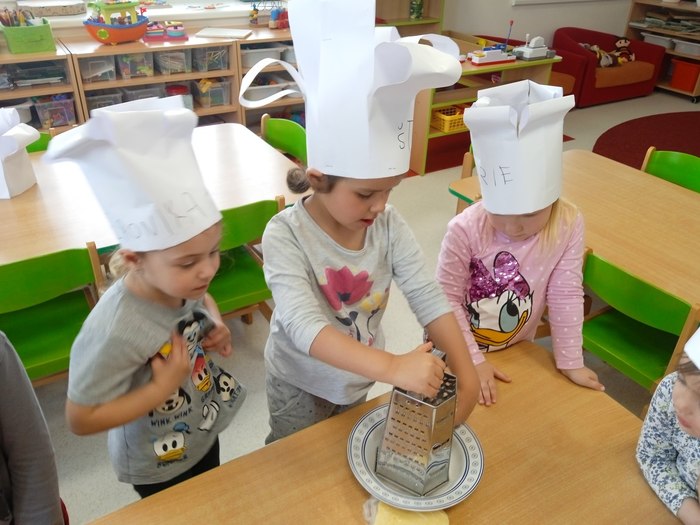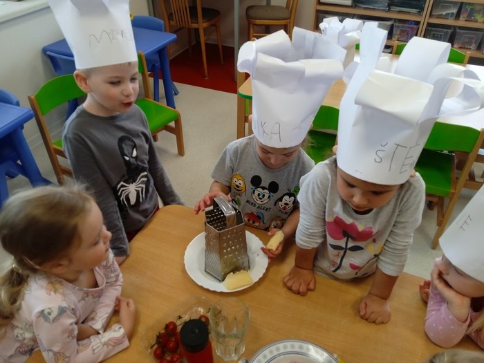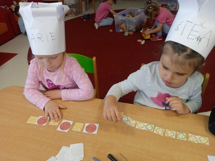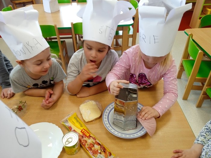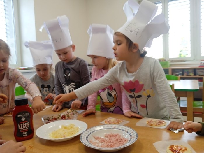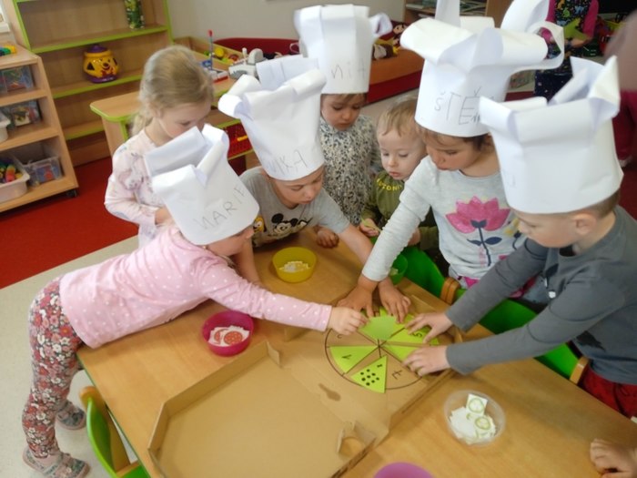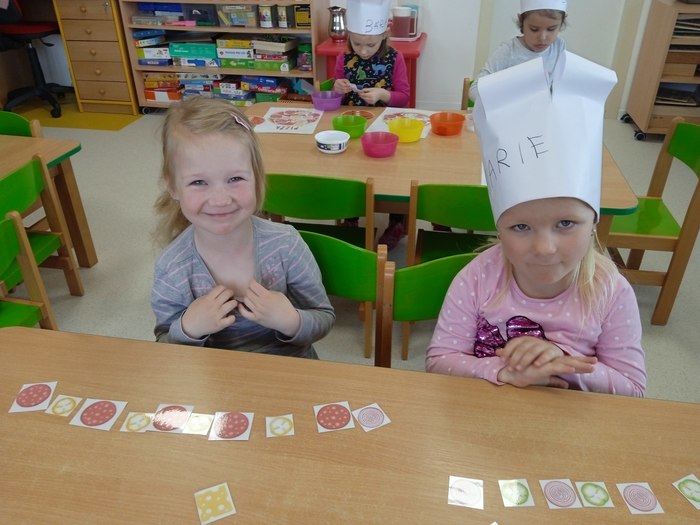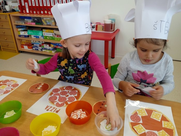 V tomto týdnu jsme se dětem snažili přiblížit různé druhy povolání, povídali jsme si čím jsou rodiče a co ke své práci potřebují. Kladli jsme dětem otevřené otázky, proč musíme pracovat, co by se stalo kdyby někdo nedorazil do práce.... Pomocí pohádky "Jak krtek ke kalhotkám přišel" jsme si přiblížili povolání švadleny. Vyzkoušeli jsme si výtvarnou techniku batikování a vyrobili si kalhotky pro krtečka. Rozvíjeli jsme tak jemnou motoriku, představivost a zručnost. Ztvárnili jsme pomocí pohybu zvířátka, která krtkovi pomáhala. Součástí tohoto tematického bloku byl projektový den "stavitel mostů". Děti pomocí příběhu o Karlově mostě si přiblížily stavbu a historii, jak tento most vznikl, kdo jej nechal zhotovit a co vše na něm najdeme. Pomocí kostek z LEGA a předmatematických představ se první děti snažily postavit most samostatně a následně stavěly pilíře dle předlohy. Děti si tak postavily most, po kterém se dá doopravdy chodit. Zahráli jsme si na zahradníky a největším zážitkem bylo v závěru týdne hra na kuchaře a pečení pizzy. Uvolňovali jsme ramenní kloub pomocí grafomotorického cviku na velký formát (míchání v hrnci), vyrobili jsme si kuchařskou čepici (správný úchop nůžek a nácvik stříhání po linii), trénovali jsme posloupnost v řadě a předmatematické představy. Odměnou bylo samotné pečení pizzy, na které si děti s chutí pochutnaly.