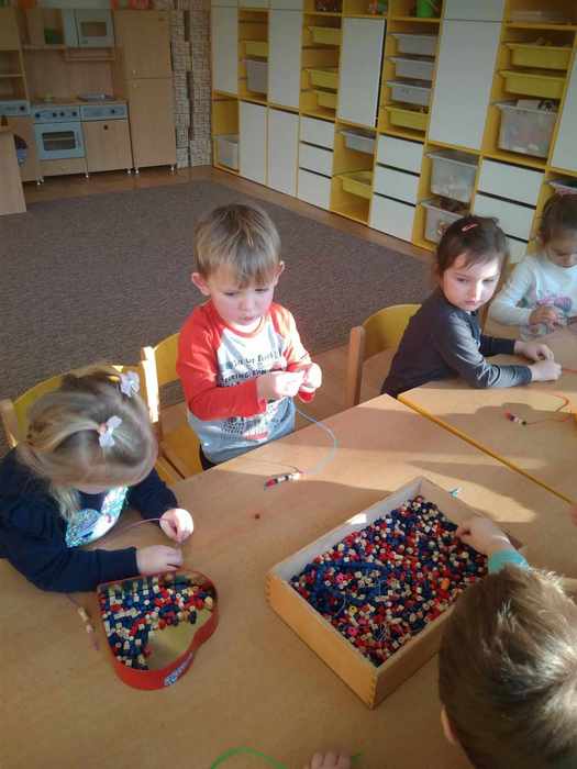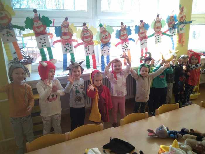V týdnu od 8.1. do 12. 1 2024 jsme si povídali na téma ,,Jdeme na maškarní ples". Naučili jsme se báseň Princeznička na bále od Fr. Hrubína. Modelováním a navlékáním barevných korálků jsme si procvičili nejenom jemnou motoriku, ale i představy - krátký x dlouhý, barvy, počet 1-4....Z papíru jsme si vyrobili krásného klauna, stříháním a lepením krepového papíru - škrabošku a hrou s barevnými tvary -- trojúhelník, kruh a čtverec. Taky jsme si povídali o plese, za co děti půjdou a na písně Inky Rybářové Klauni a Karneval jsme si zatančili v různých čepičkách - někdo si vybral broučka, někdo ježka, koníčka, čepeček červené Karkulky, kůzlátka... a bylo veselo jako na pravém maškarním plese.