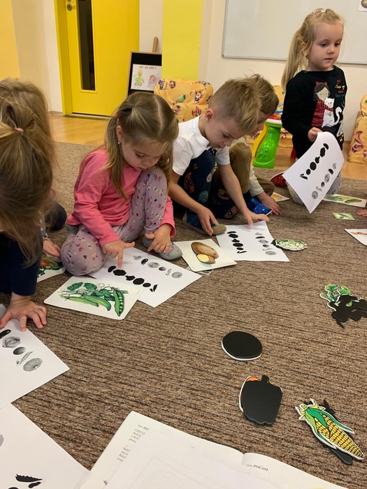 Děti si poslechly pohádky k tématu, naučily se báseň Brambora a píseň s pohybem Šel zahradník. Zahrály si Kimovu hru - na postřeh ( co v řadě obrázků zmizelo) Na interaktivní tabuli pracovaly s programem Barevné kamínky - hry ve dvojicích.