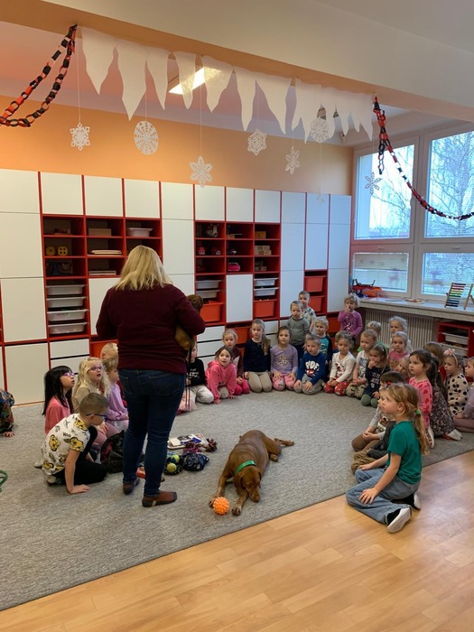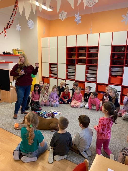 V úterý proběhla ve třídě Canis terapie. Děti se seznámily se psy, jejich rasou, jmény. Vyslechly si povídání z úst dospělé osoby o různých plemenech a k čemu slouží lovečtí psy, vodící apod., jak se o psy starat, jak se k nim chovat. Děti měly možnost se s pejsky mazlit a hladit je. Na závěr viděly ukázku výcviku psa.