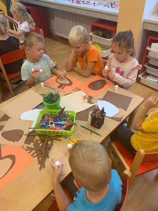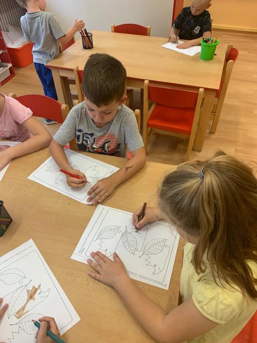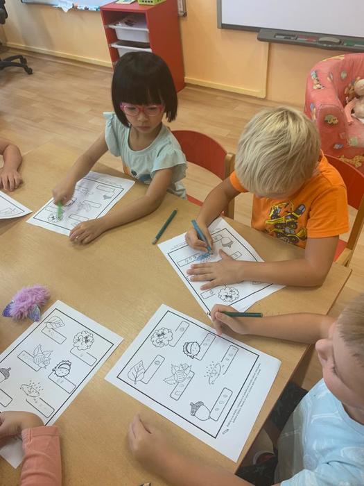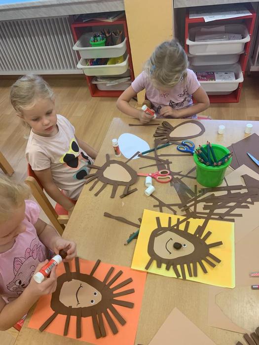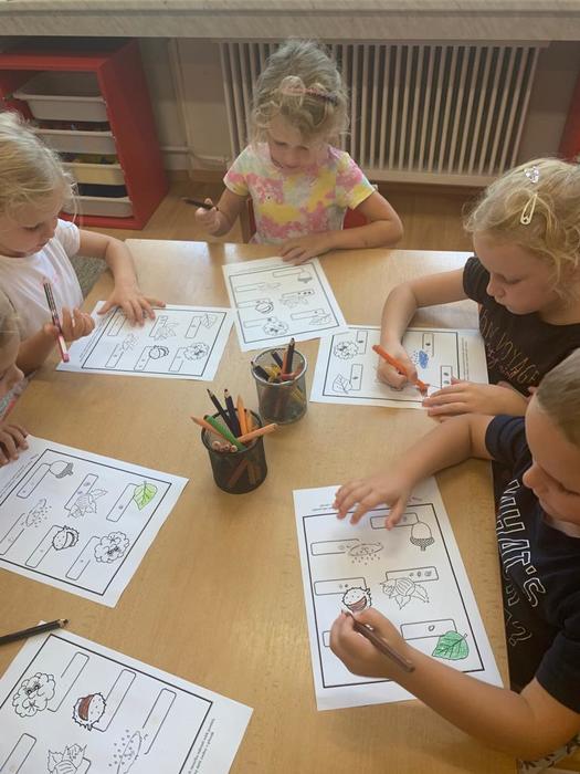 Vypracovávaly pracovní list: Vytleskej a označ puntíkem správný počet slabik ve slově. Na uvolnění zápěstí vykreslovaly žilky na listech a ve výtvarné činnosti stříhaly po čáře a po té lepily a dokreslovaly "ježka"