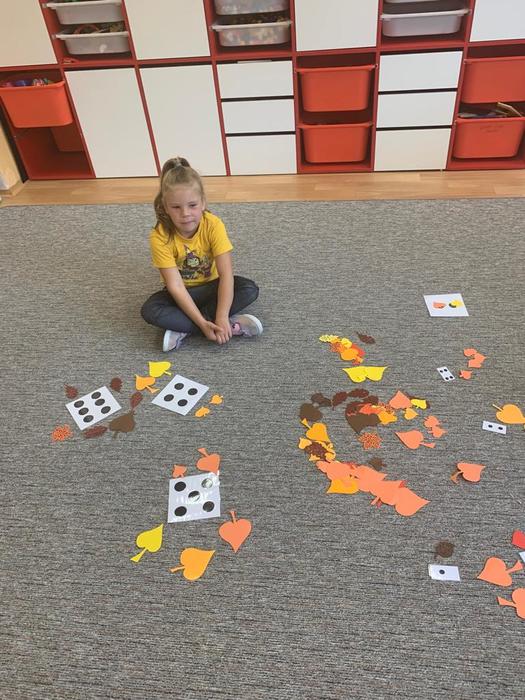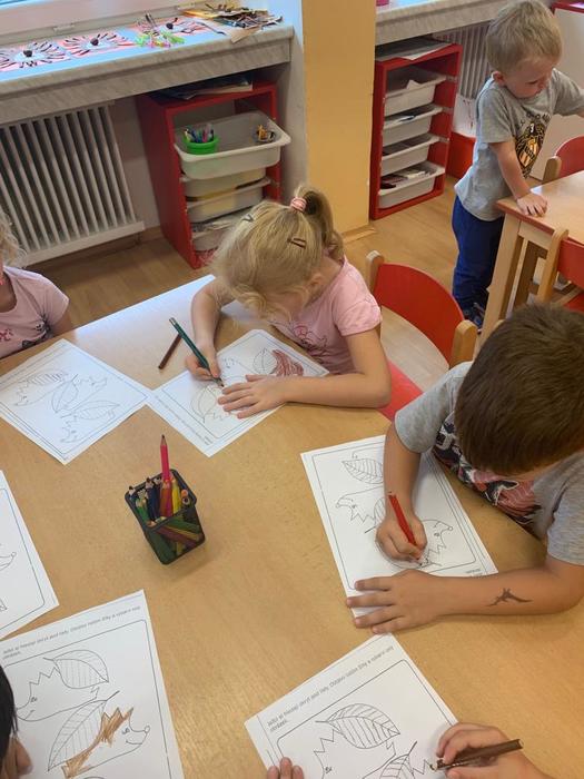 Při pobytu venku jsme dbali na bezpečné přecházení silnice. Na školní zahradě děti pozorovaly podzimní změny v přírodě - sběr kaštanů a zbarveného listí. Zahrály si pohybovou hru s míčem.