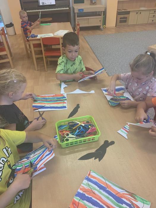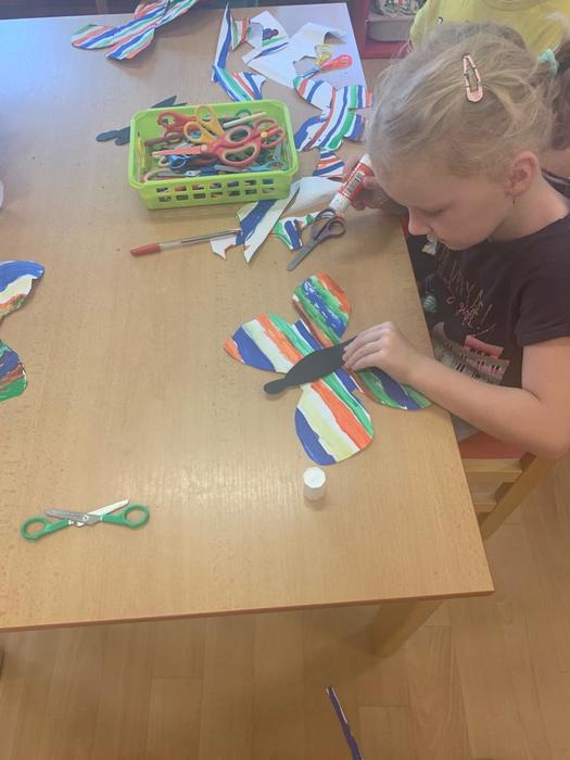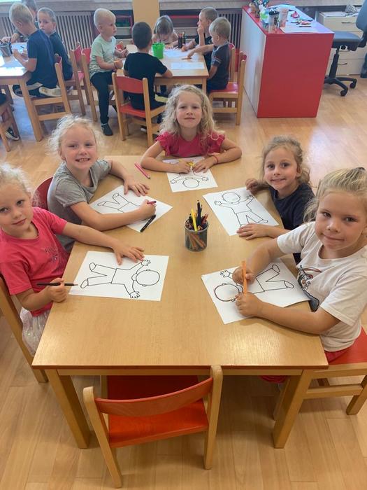 Děti malovaly a následně stříhaly po čáře - Motýl, kreslily postavu i s detaily( správný počet prstů na ruce, obočí, řasy...) Vypracovávaly pracovní listy "dokresli části obličeje", svislé čáry "prší"