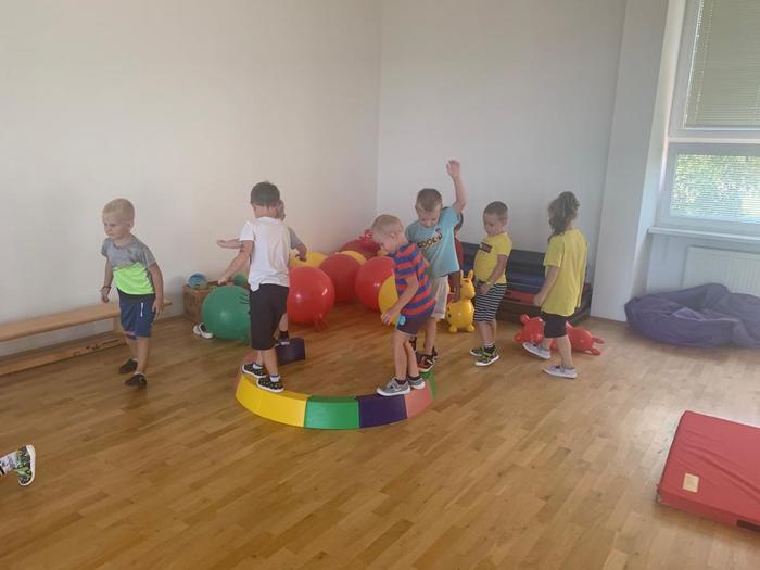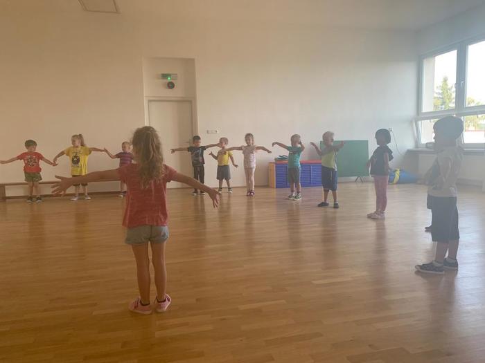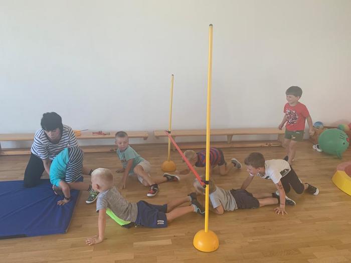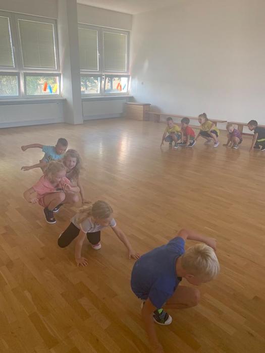 V tělocvičně cvičily na nářadí, na žíněnce se učily kotoul vpřed.