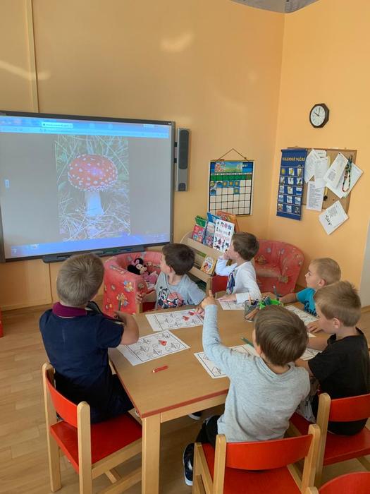 Na interaktivní tabuli děti zhlédly jedlé a jedovaté houby a seznámily se s některými názvy hub.