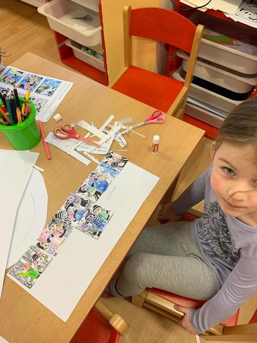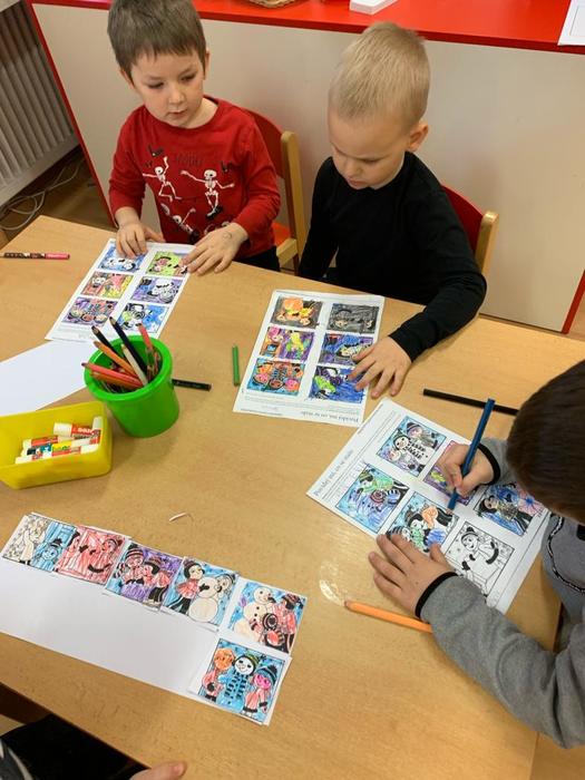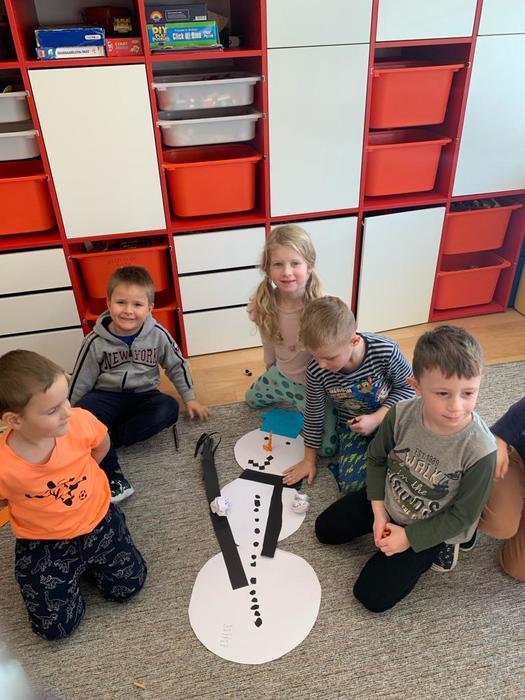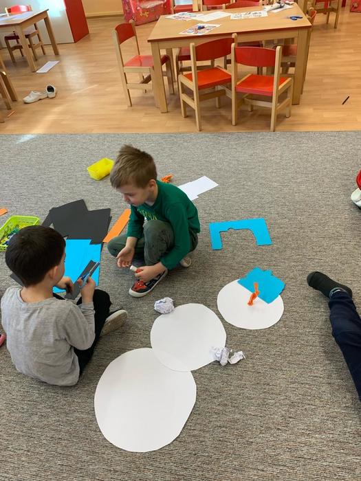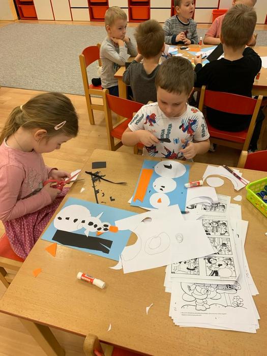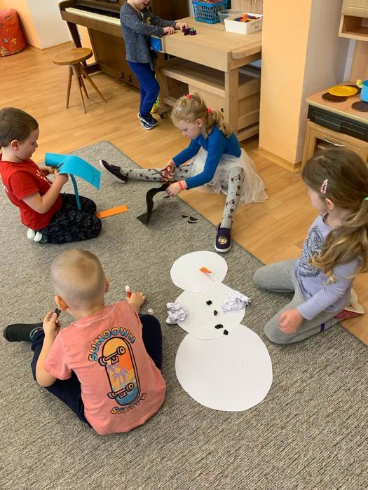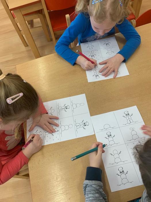 Vypracovávaly pracovní listy " dokresli sněhuláka přesně podle pokynů ( procvičovaly si prostorovou orientaci - vpravo, vlevo, na ,pod...), dokreslovaly sněhulákovi co mu chybí - procvičovaly si pozornost na detaily, stříhaly a po té skládaly, lepily příběh " stavění sněhuláka"