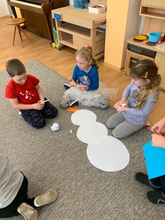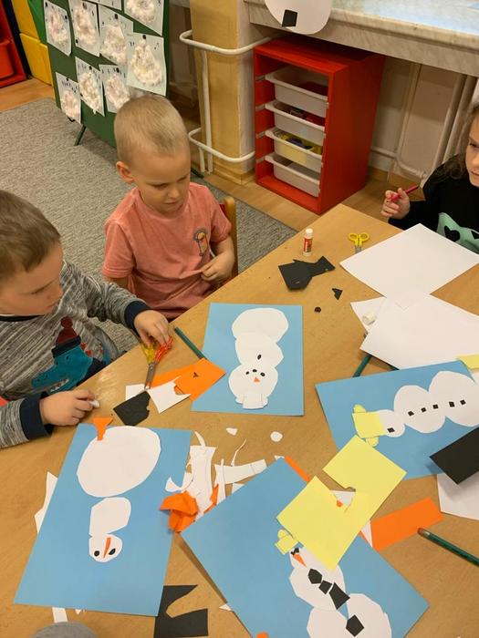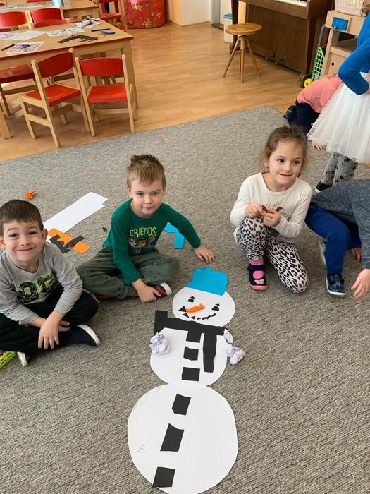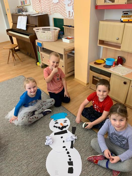 Ve výtvarné činnosti vyráběly sněhuláky a zimní domeček. Upevnily si správný úchop tužky, nůžek, zopakovaly si názvy geometrických tvarů.