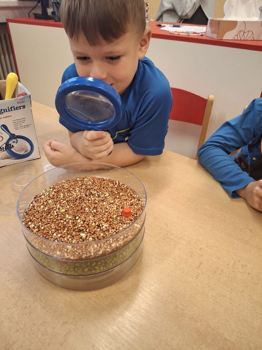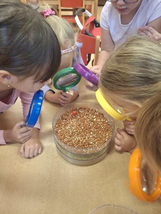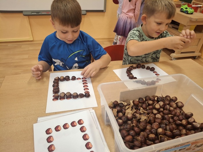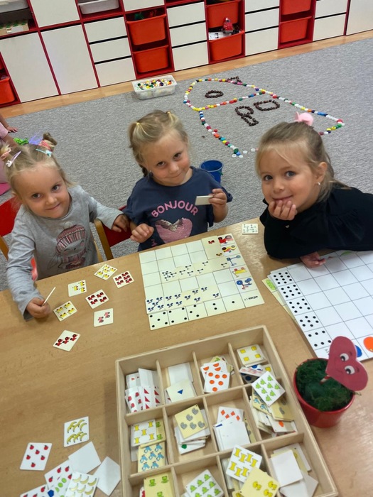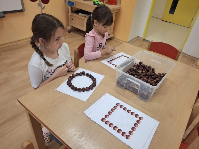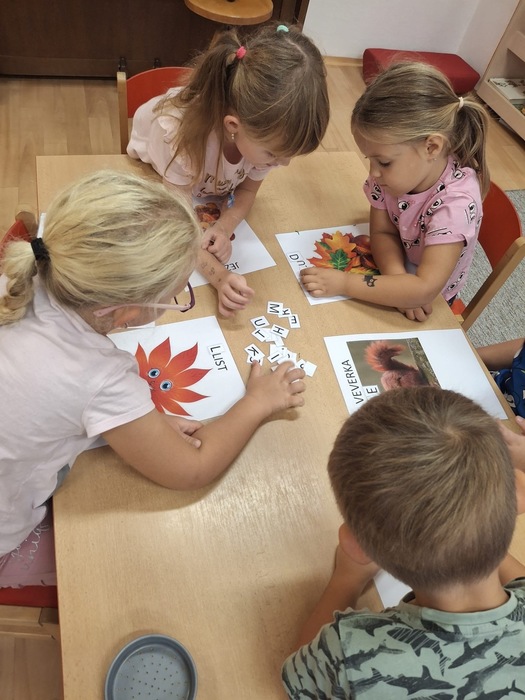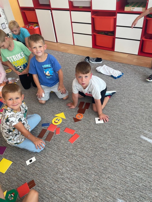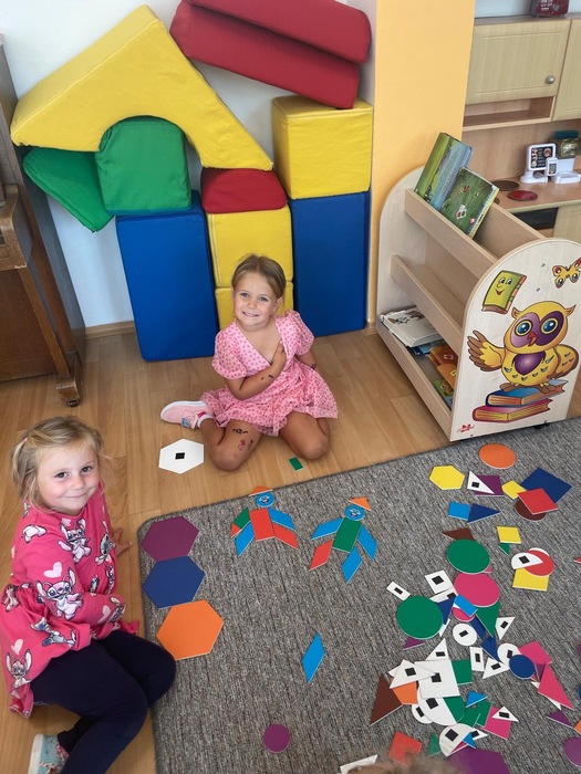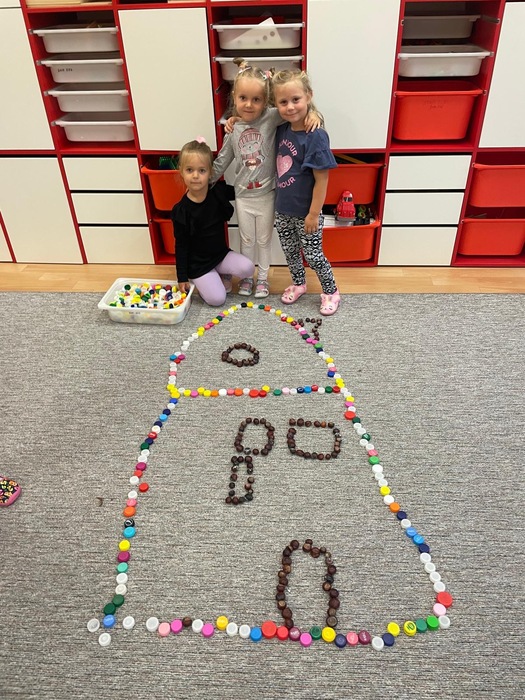 Pracovaly ve skupině- tvoření z víček - Domeček, posloupnost děje - Jak rosteme a skládaly postavy z geometrických tvarů.