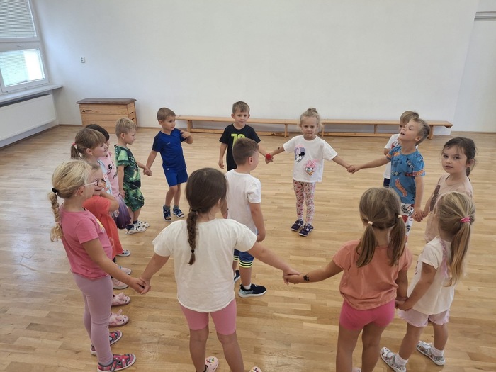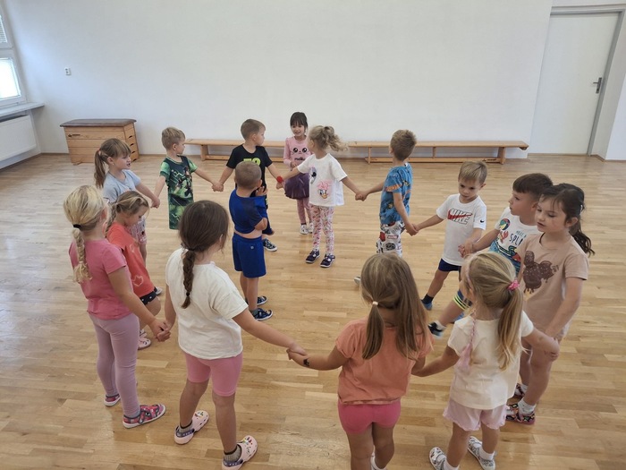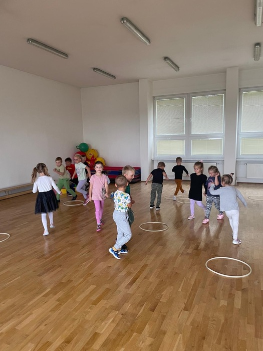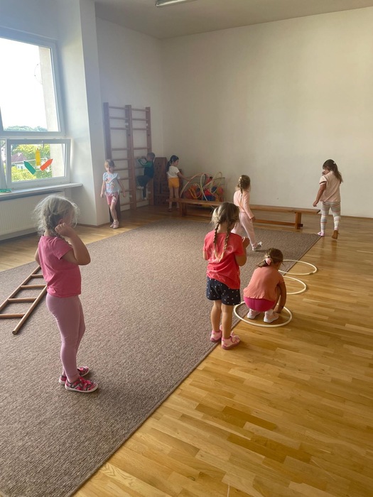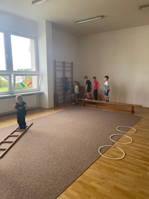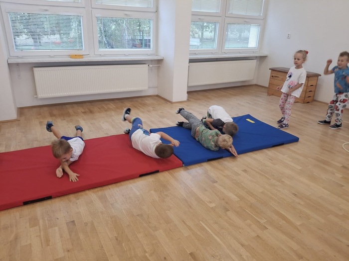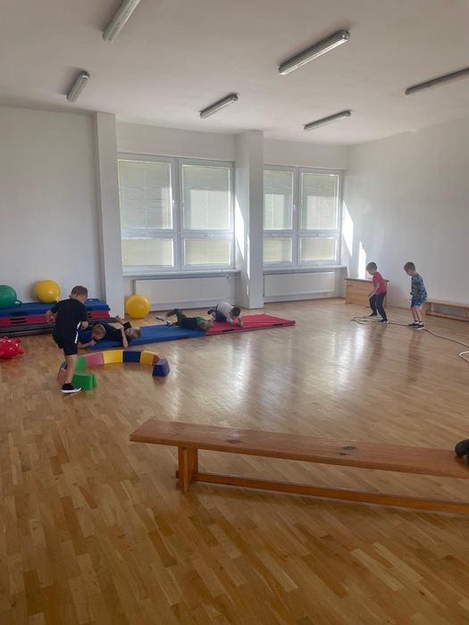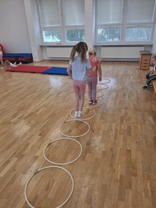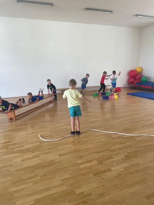 V tělocvičně cvičily ve družstvech na nářadí a naučily se kotoul vpřed s dopomocí učitelky.