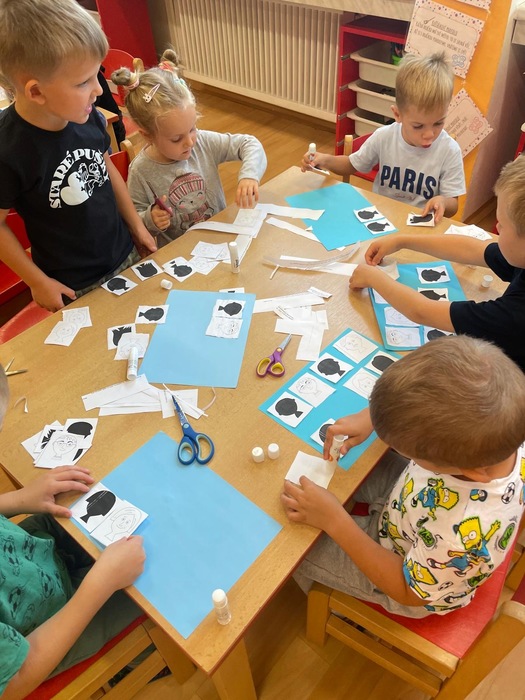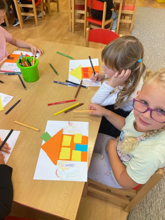 Ve výtvarné výchově děti stříhaly, skládaly a lepily domeček , ke kterému pak dokreslovaly maminku, tatínka i sourozence.