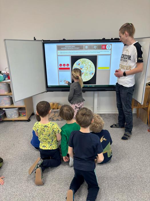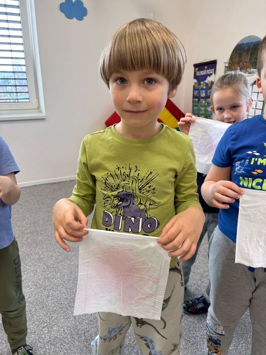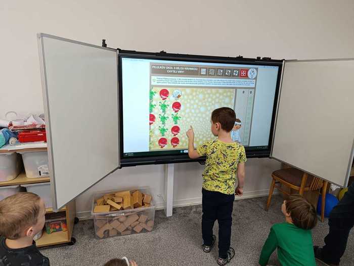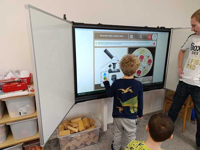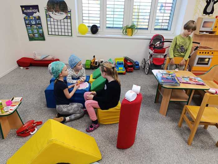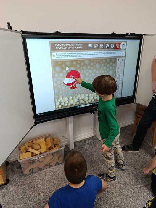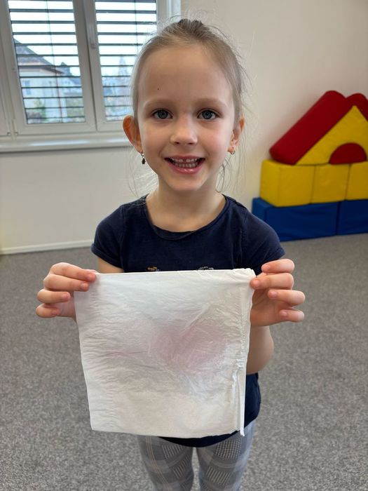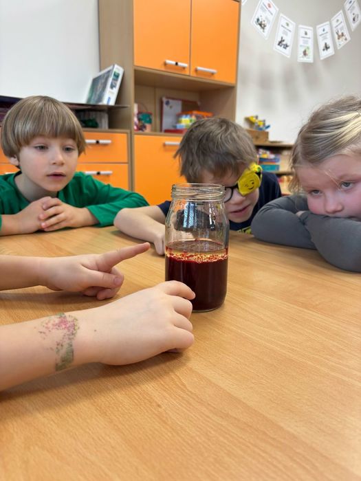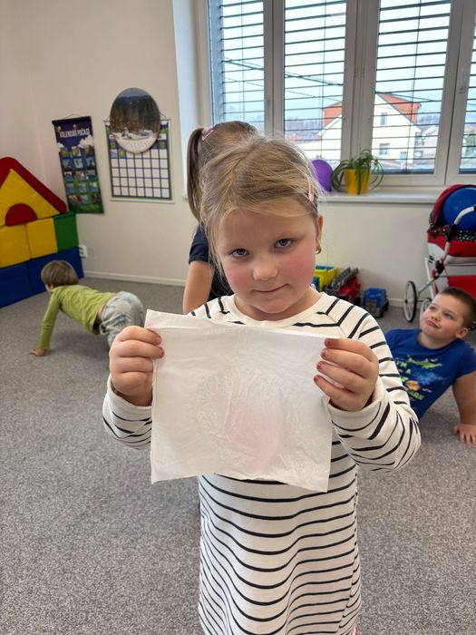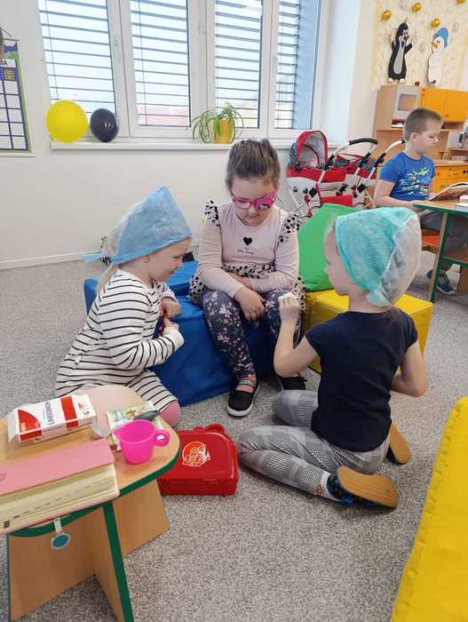Pokusem s rozprašovačem naplněným obarvenou vodou a třpytkami si uvědomili, jak se bacily rozletí do okolí, když si nepřikryjeme ústa a nos. Také jsme prováděli pokusy a hráli si na laboratoř ( nabírali tekutinu slankou - jako pipetkou), plnili úkoly na interaktivní tabuli a hrou Na lékaře si rozvíjeli a upevňovali znalosti ohledně lidského těla, nemocí, zdravé stravy, otužování a správných hygienických návyků.