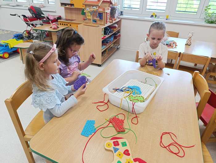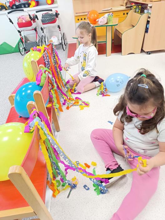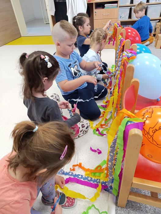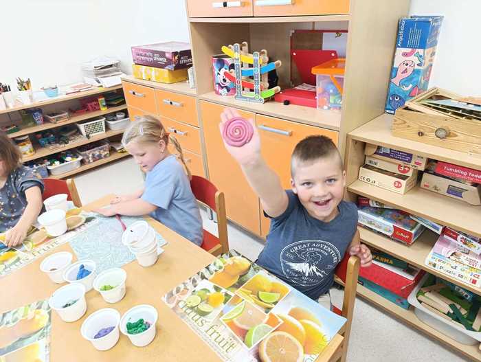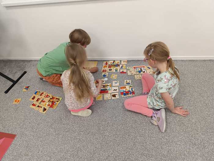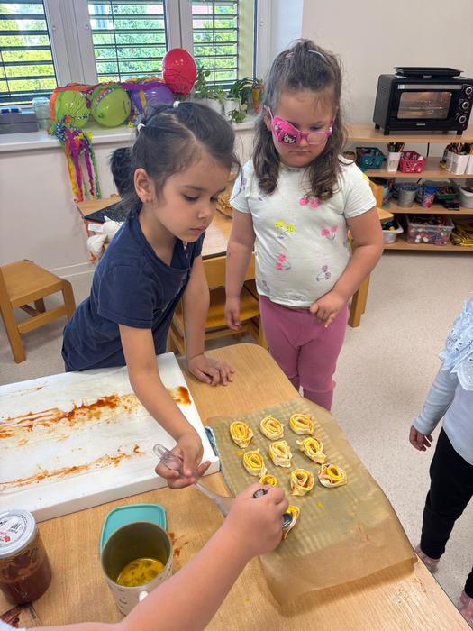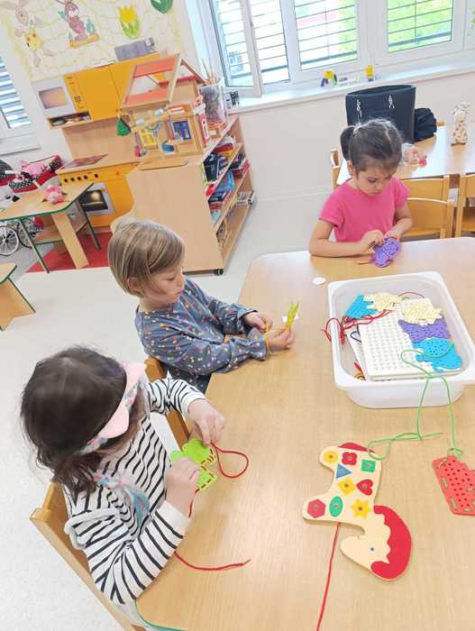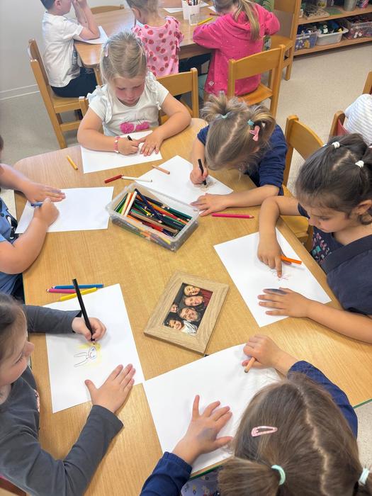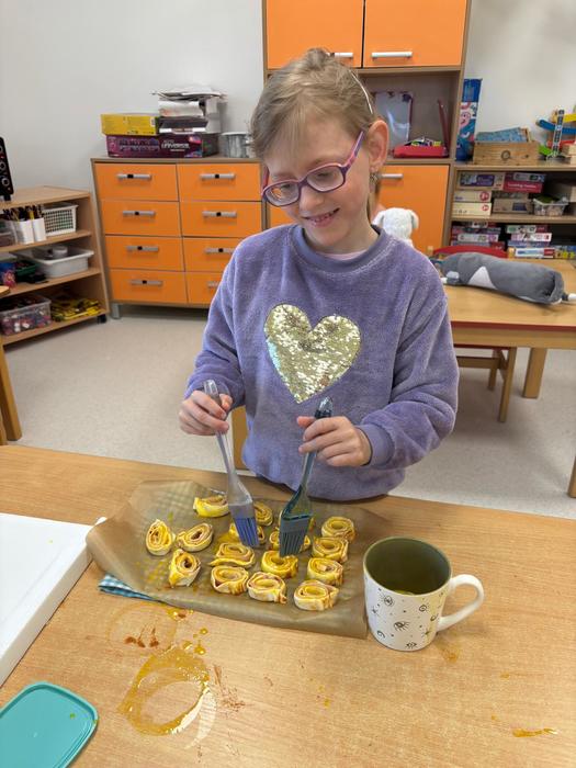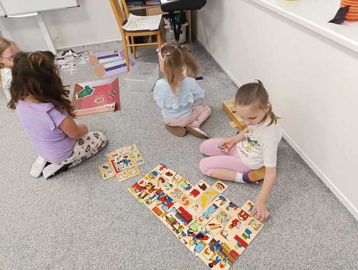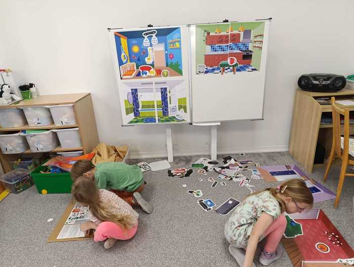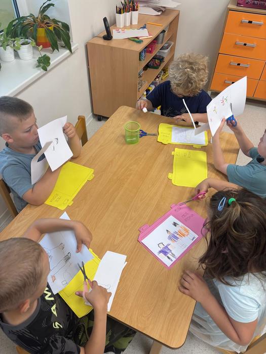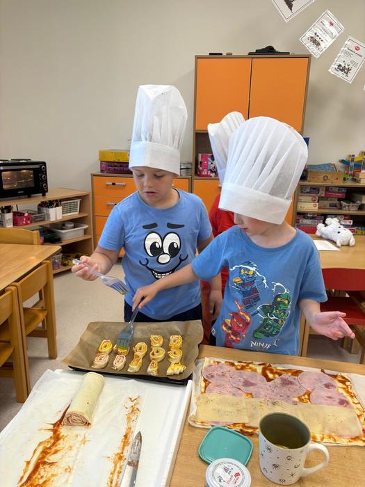 Během těchto čtrnácti dnů jsme si vyzkoušeli několik zaměstnání - např. Kadeřnictví - stříhání krepového papíru, Pekař - pečení pizza šneků, Švadlena - provlékání tkaniček, Dizainer - návrhy interiérů, Malíř - malování, kreslení na inter.tabuli.