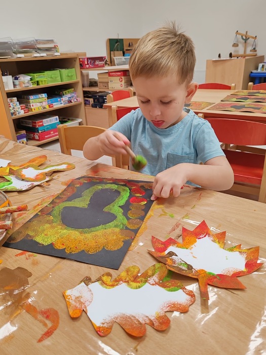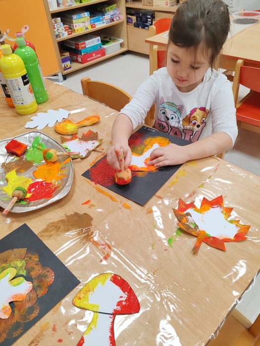 U stolečku si děti procvičily jemnou motoriku při tvoření ježka, lepily zrníčka kávy na dřevěné šablony. Ve výtvarné činnosti jsme se pustili do podzimního tvoření – pomocí přikládání šablon a otiskování barev na černý papír vznikly krásné podzimní listy a motivy. Tyto výkresy nyní zdobí naši šatnu a připomínají nám barevnou atmosféru podzimu.